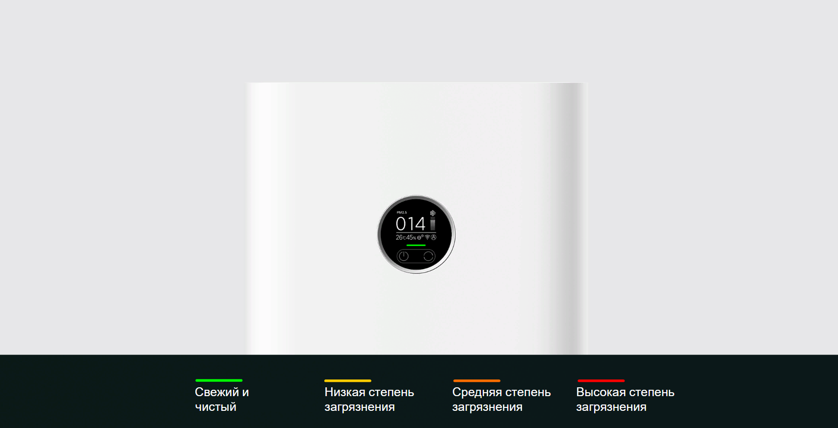 Удобные сведения о качестве воздуха в режиме реального времени, отображение концентрации PM2.5/PM10 и цветовая полоса. Настраивайте параметры очистки простыми сенсорными кнопками согласно своим потребностям в очистке воздуха.