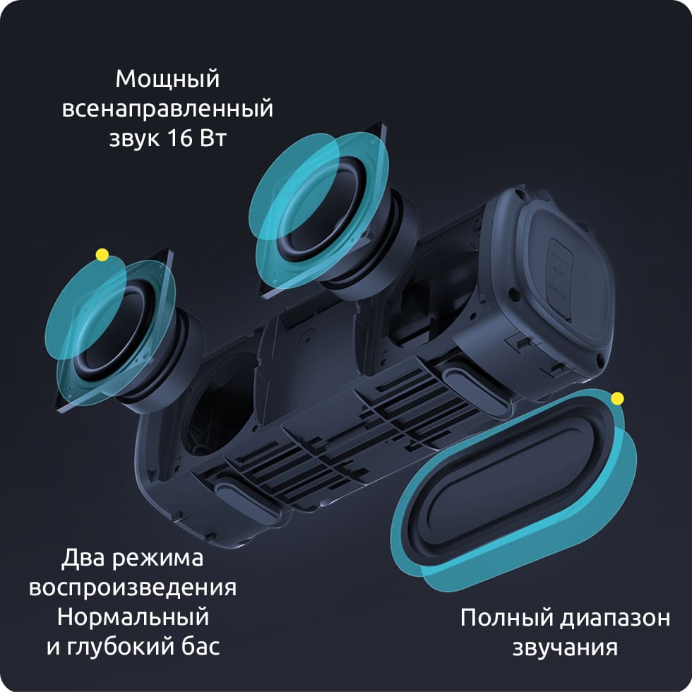 Портативная колонка оснащена мощным динамиком со всенаправленным звучанием и выдающимися АЧХ. Высокоточное расположение динамиков обеспечивает объемное трехмерное звучание, обволакивающее и пробирающее до самых глубин. Особая конструкция помогает избежать излишнего резонанса, при этом сохраняя насыщенность звучания по всей окружности, чтобы Вы могли насладиться им из любого места.